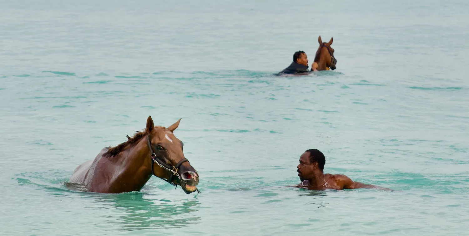 On the Caribbean Island of Barbados, an enchanting morning ritual unfolds as thoroughbred racehorses from the Garrison Savannah are led to the sea for their daily swim.