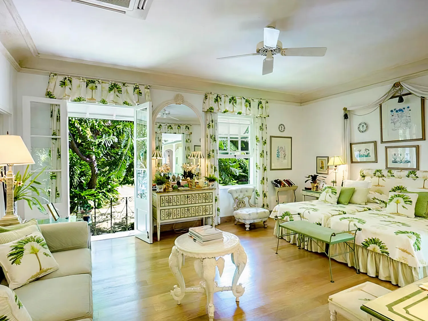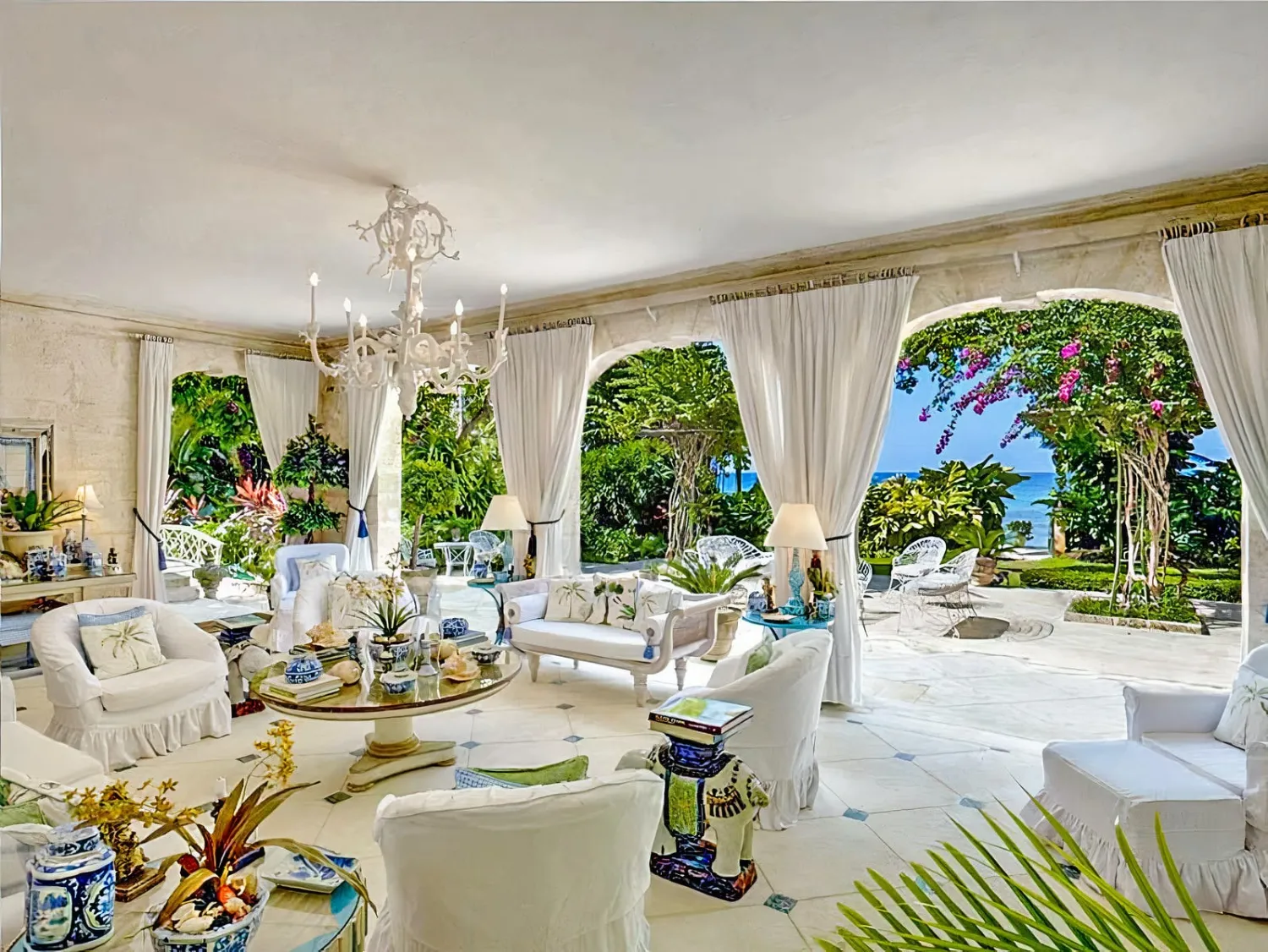 The property stretches down to the white‑sand beach, with swaying palms and pink blossoms framing the garden. Inside, the decor is rich and inviting, with thoughtful design details throughout.