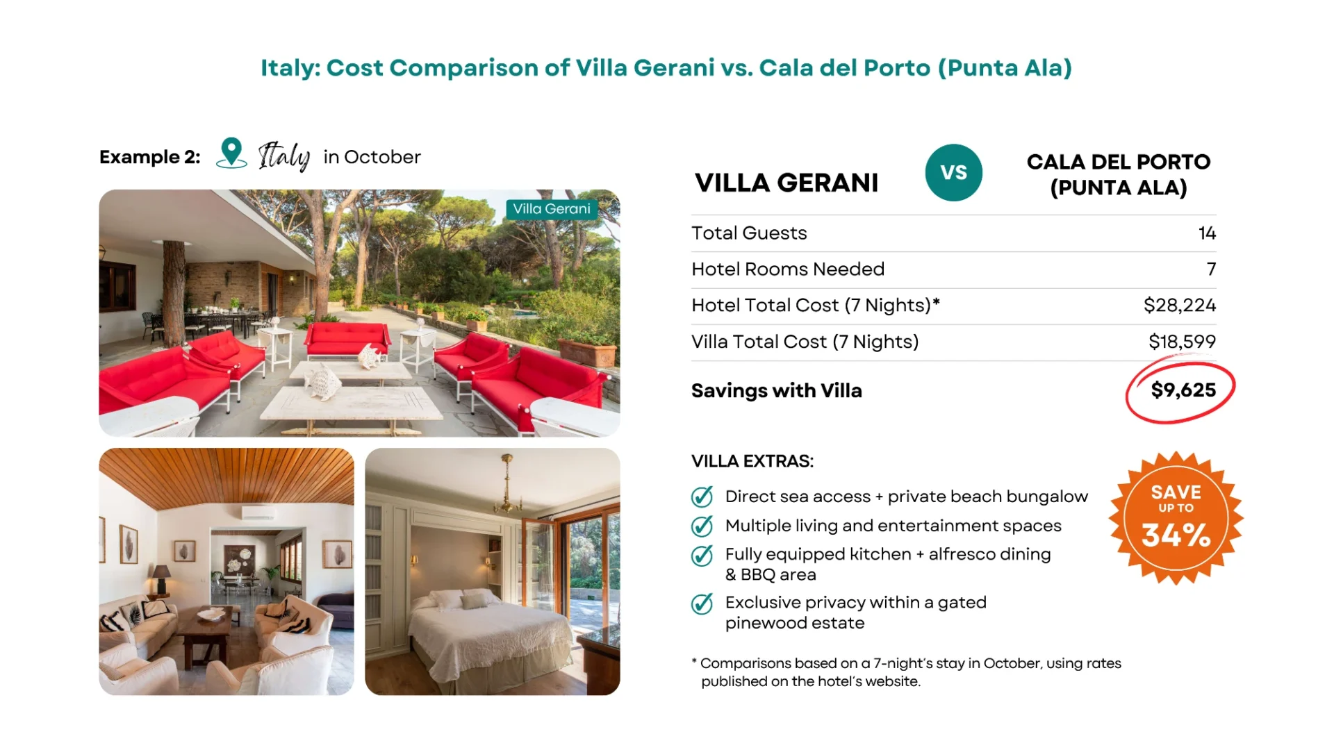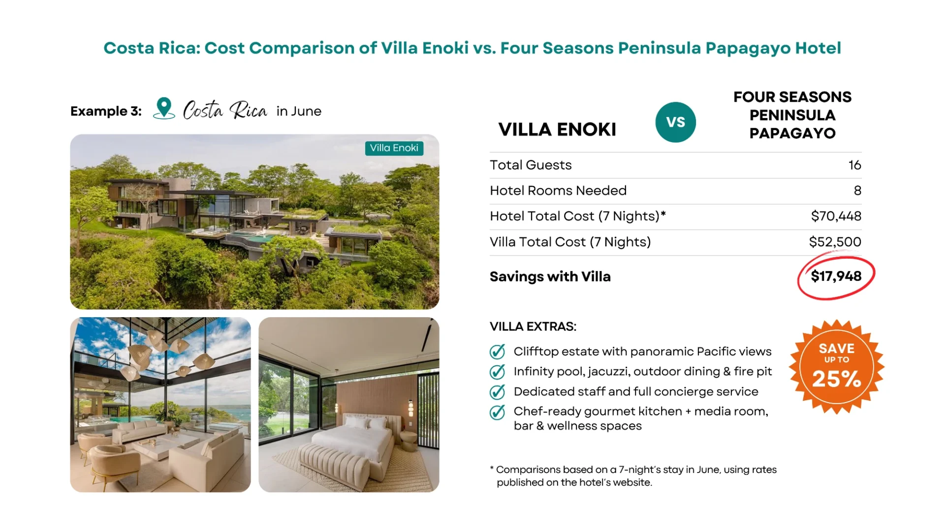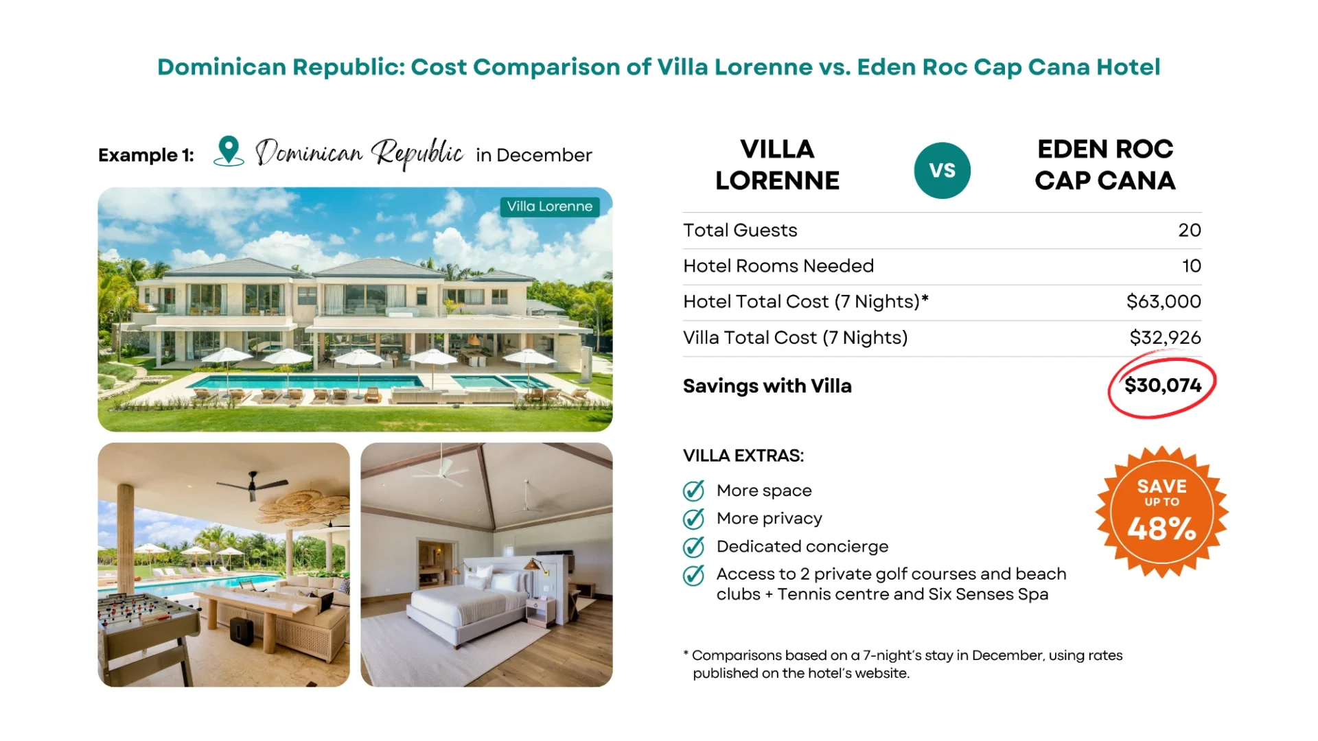 See how much you can save by staying in a villa vs. booking multiple hotel rooms.