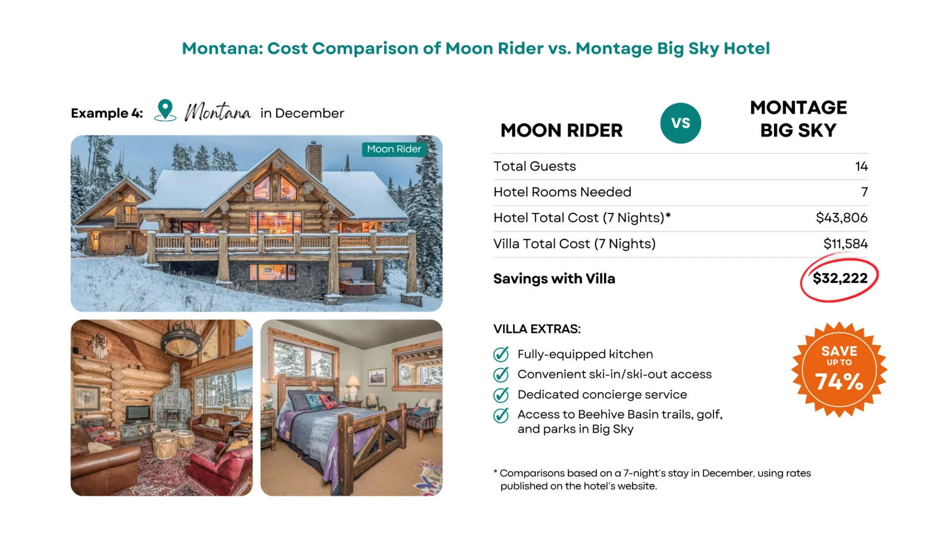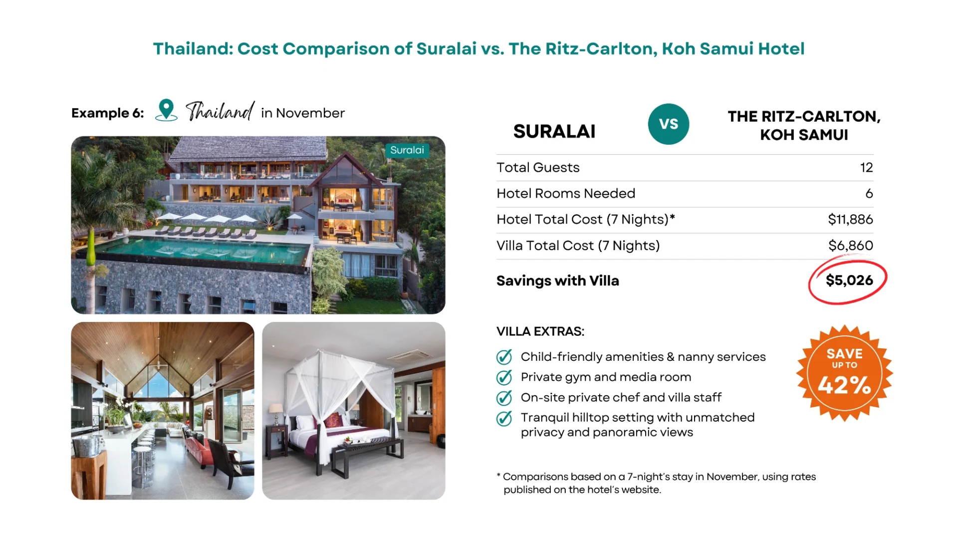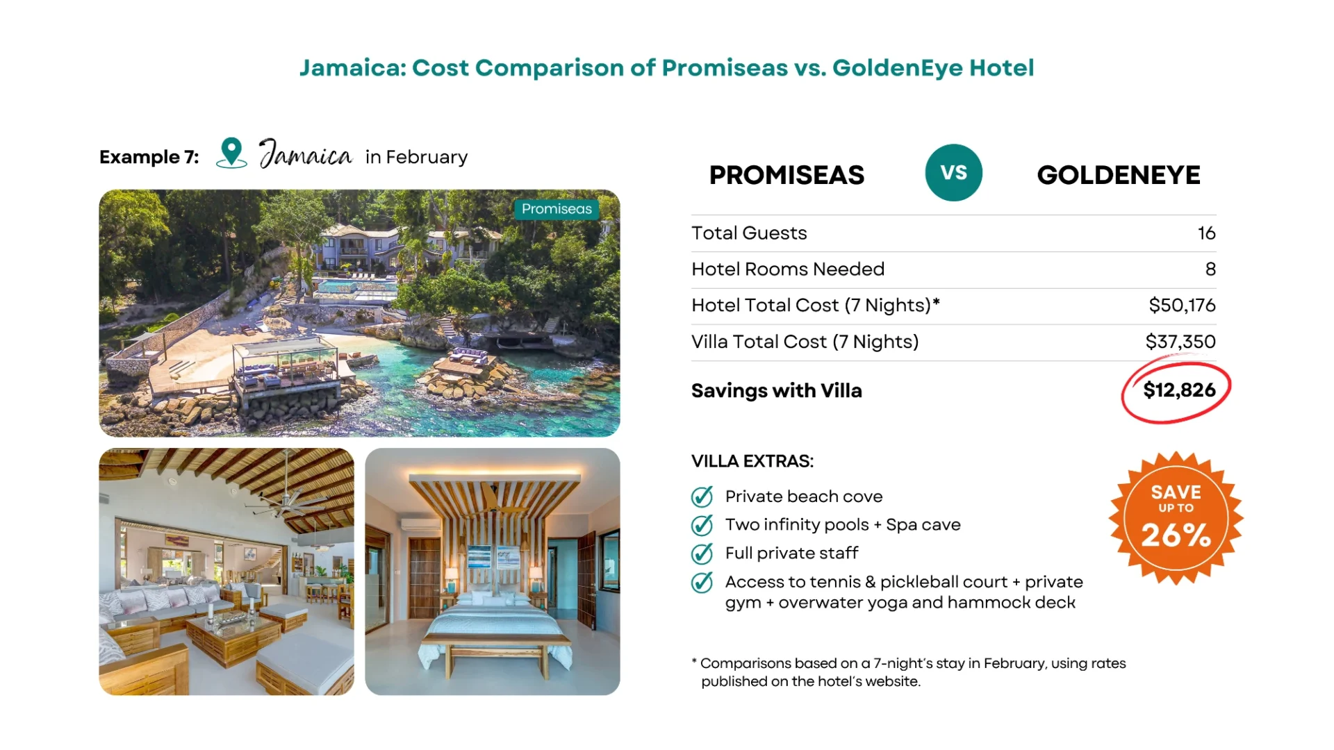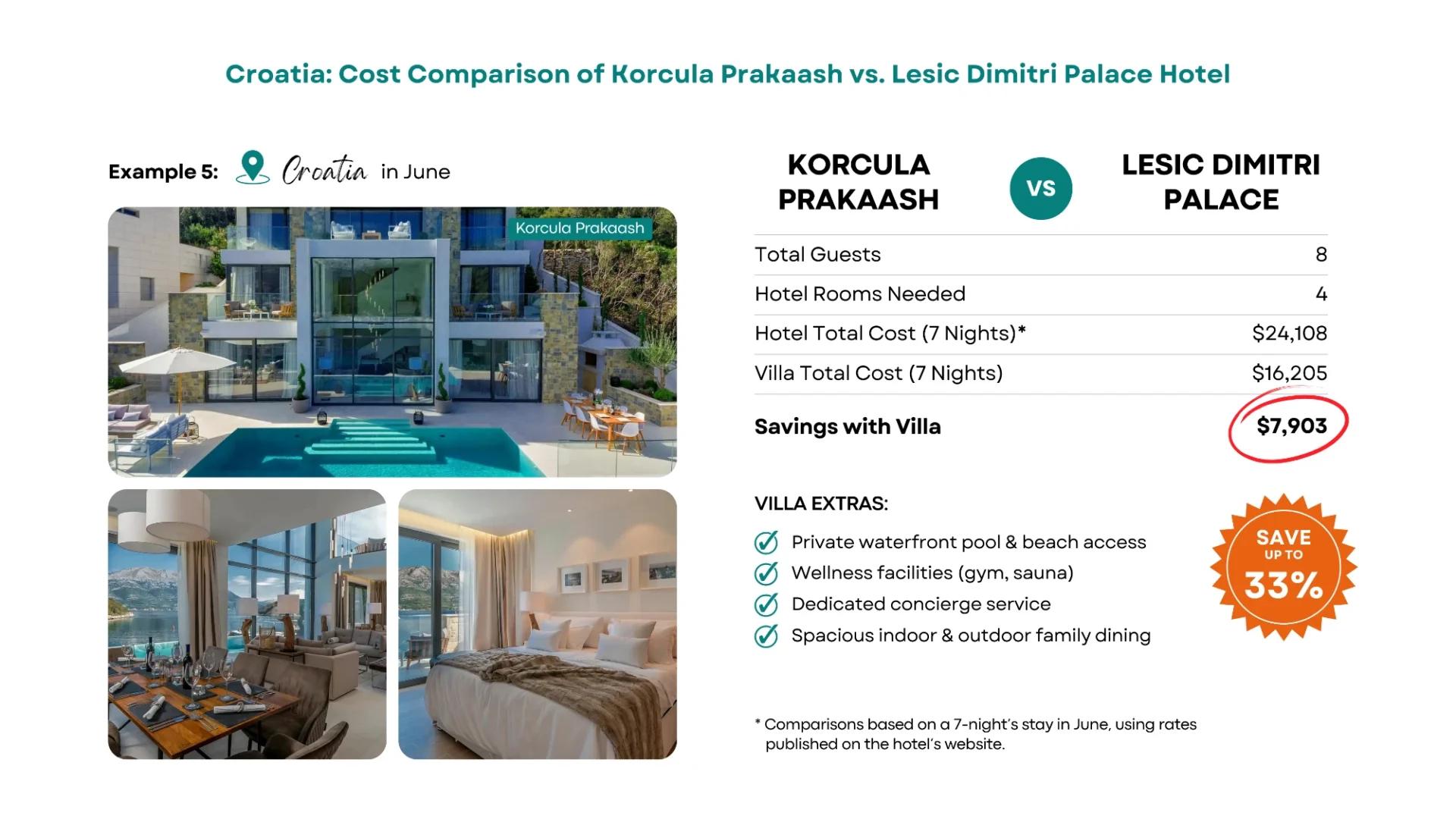See how much you can save by staying in a villa vs. booking multiple hotel rooms.