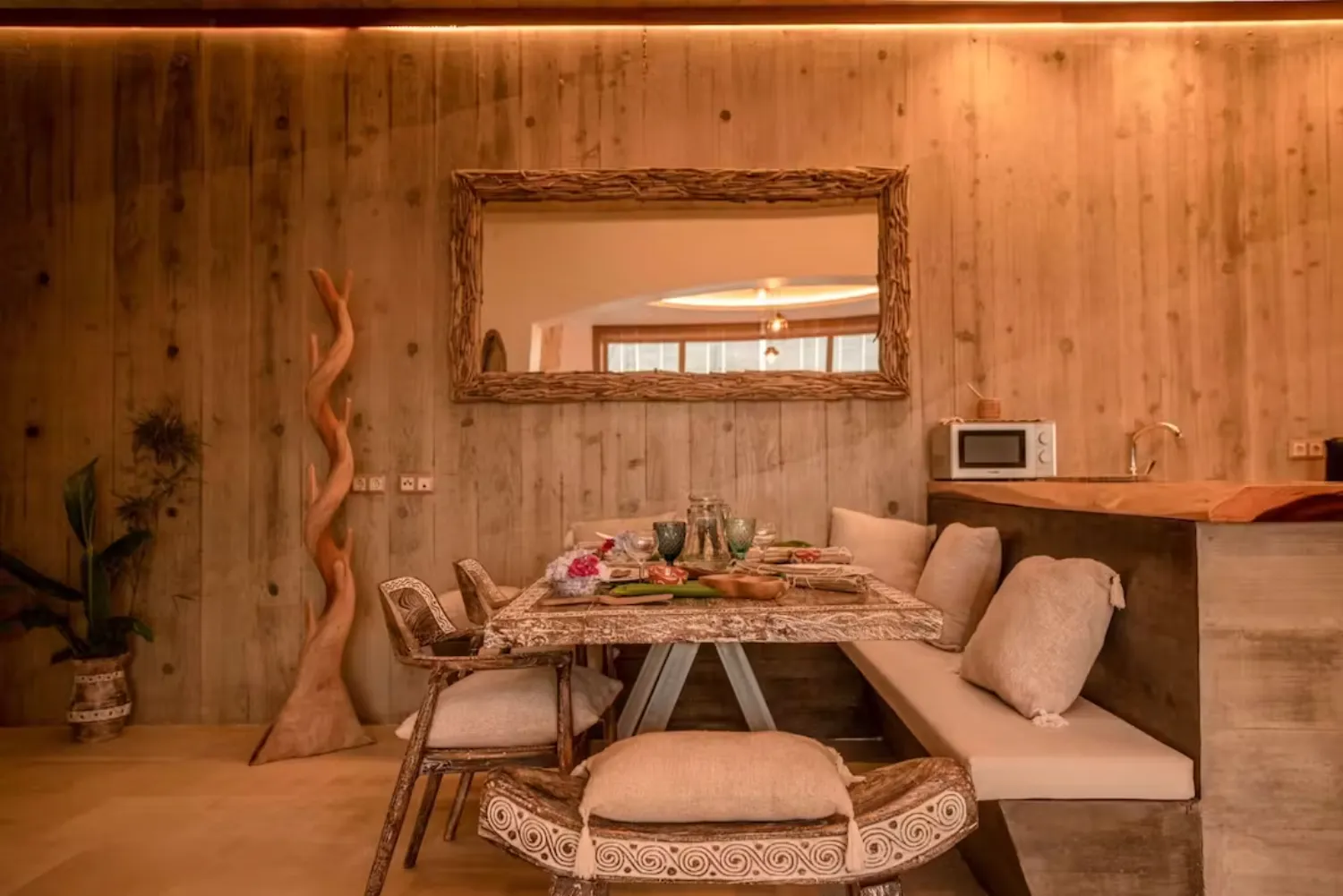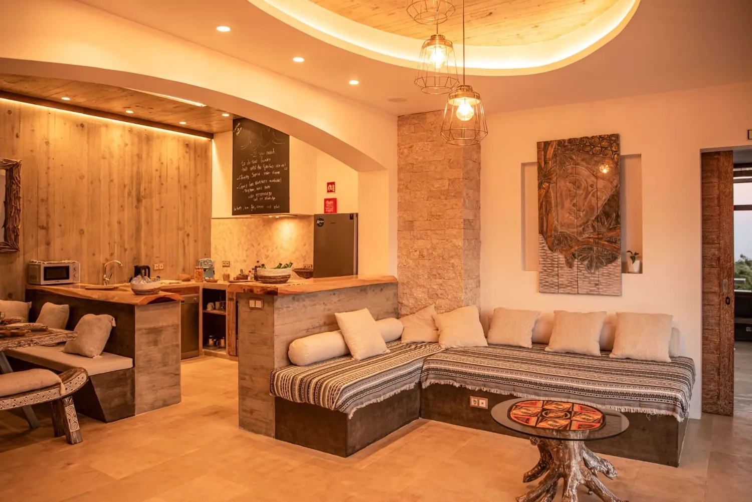 With two cozy bedrooms and two bathrooms, it’s just right for a family or two couples seeking calm and connection.