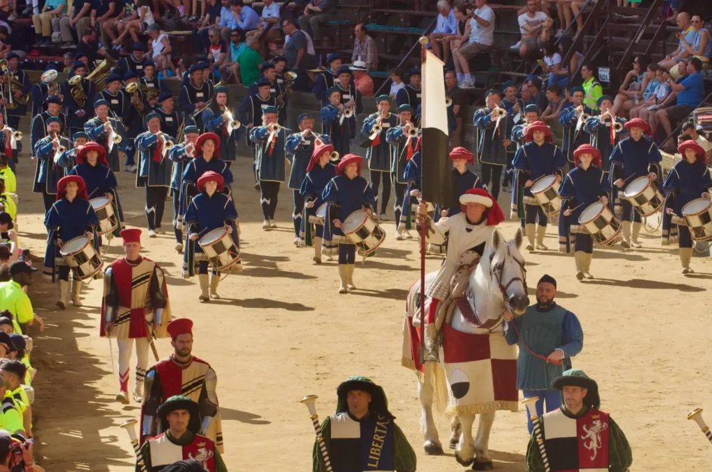 In the days leading up to the event, Siena transforms into a living stage of medieval pageantry, with colorful parades, flags, and traditional costumes filling the streets. Each contrada marches proudly with musicians and flag-throwers, while horses are blessed in local churches before the race.